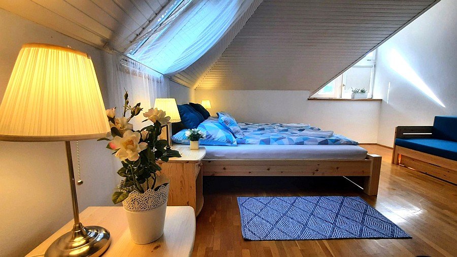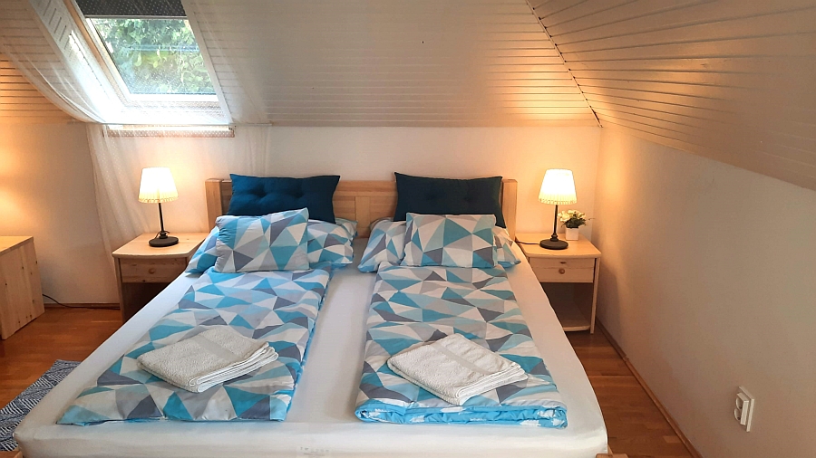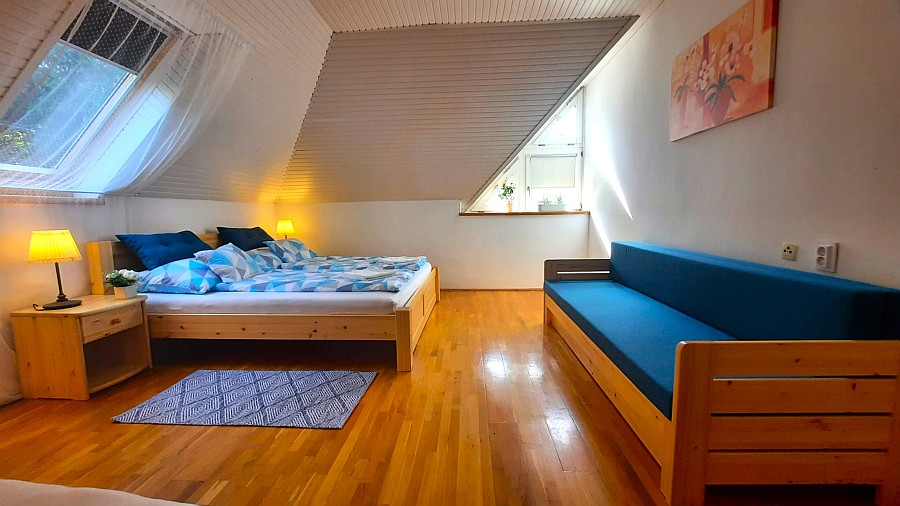 A nagyobb hálószobában egy nagy franciaágy, egy szimpla ágy és egy ágyazható kanapé van.