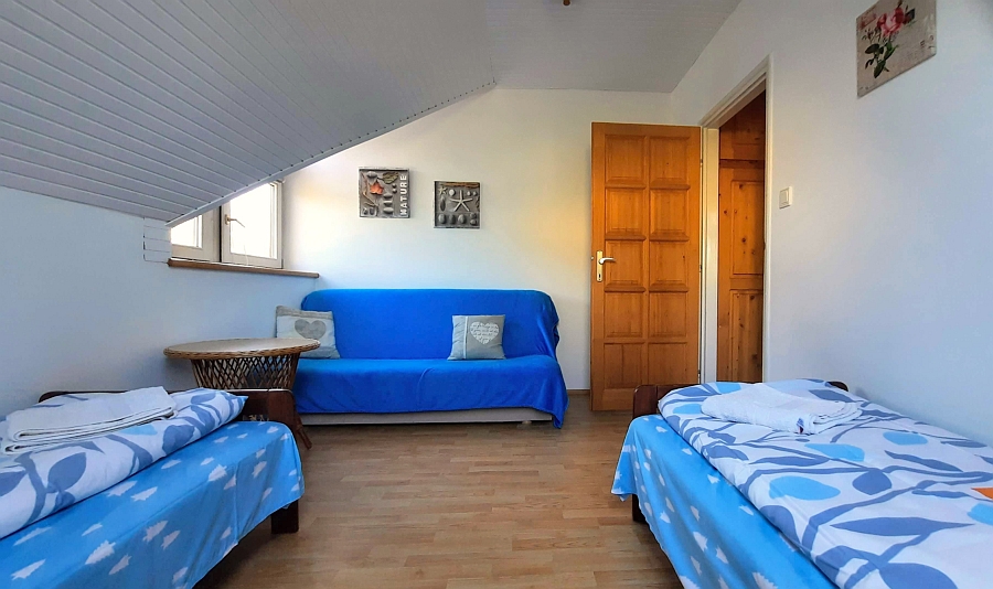 A kisebb hálószobában 3 külön fekhely van: két szimpla ágy és egy kihúzható kanapé.